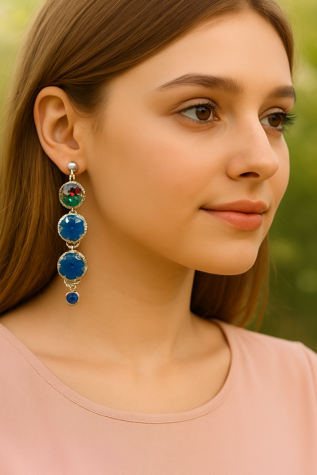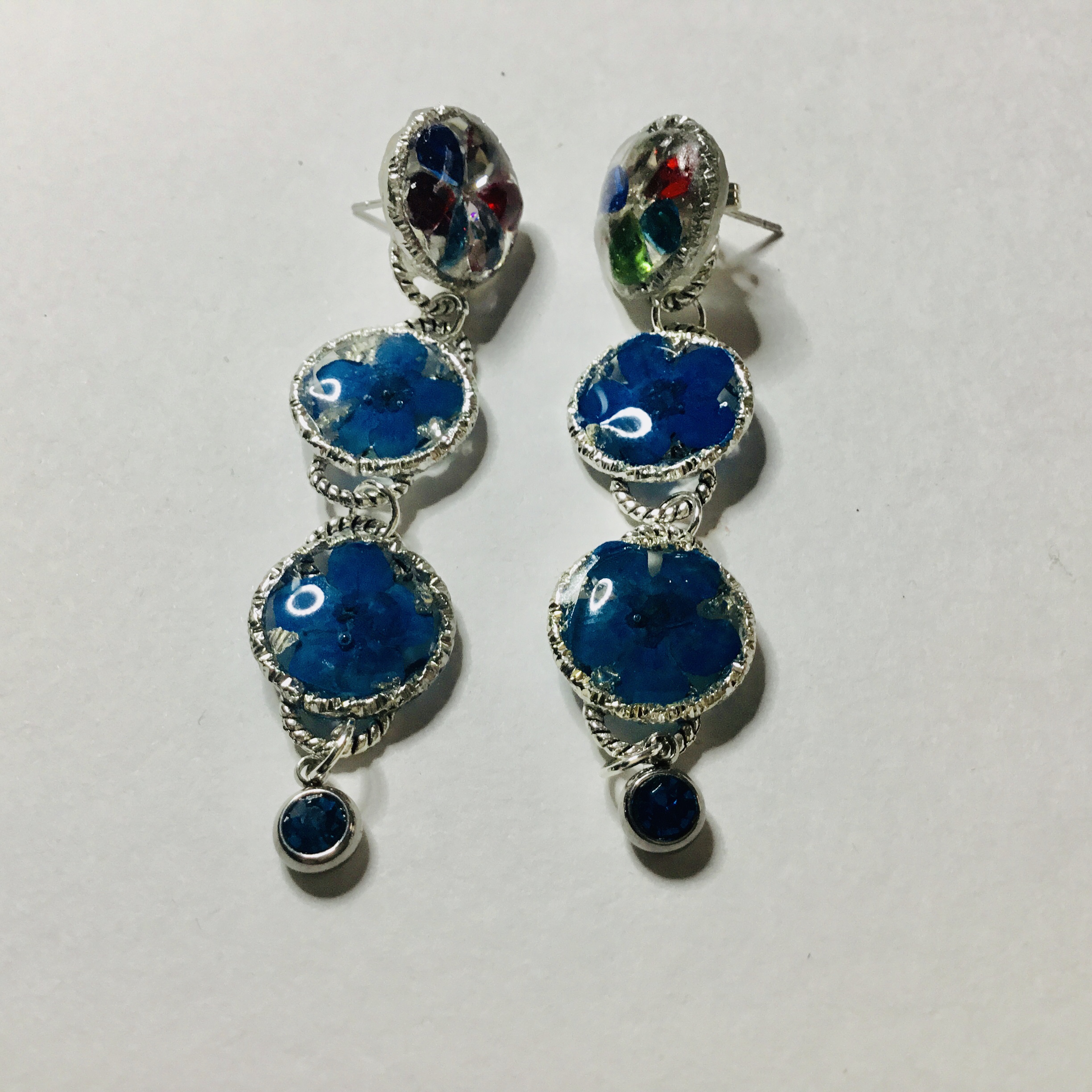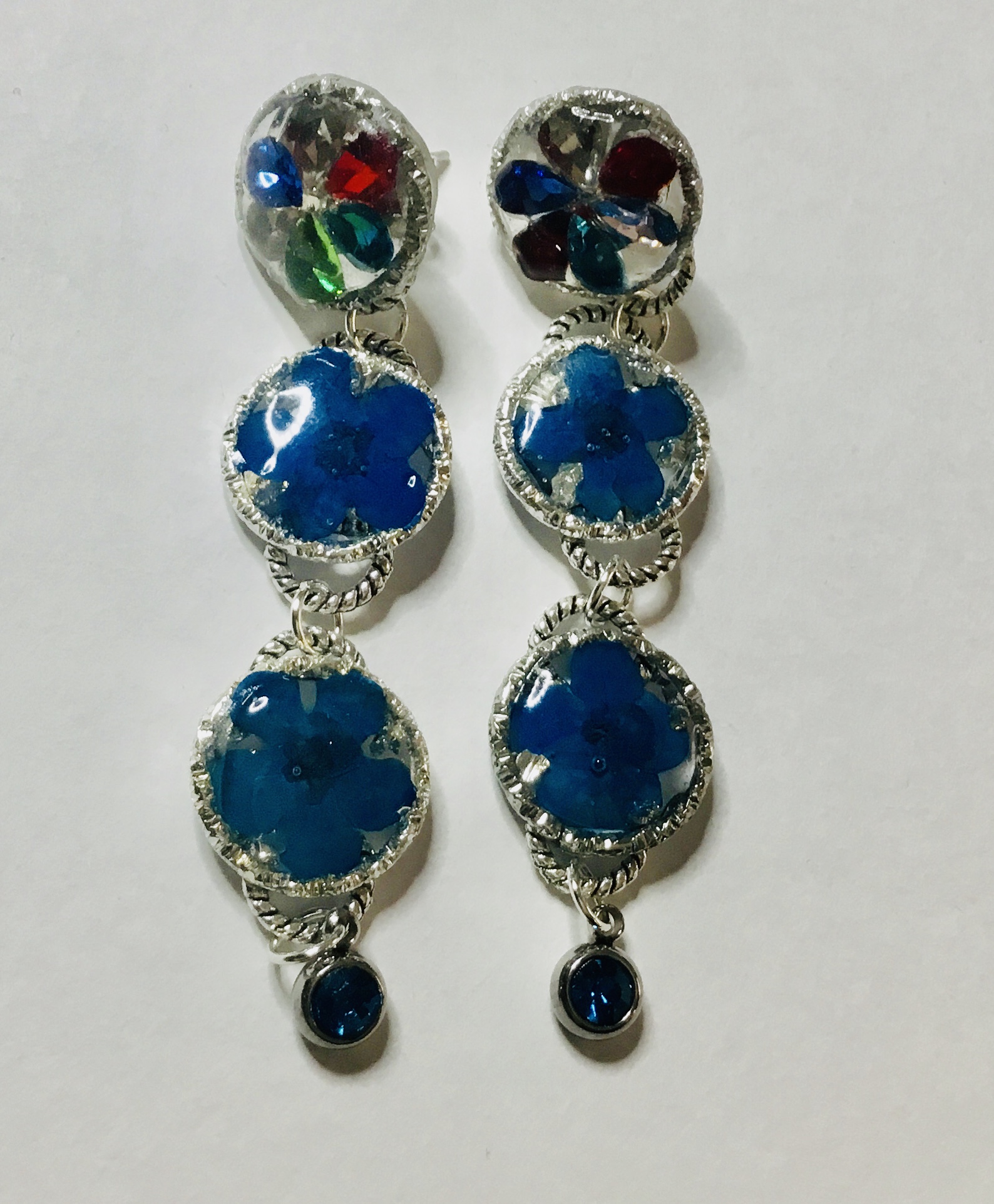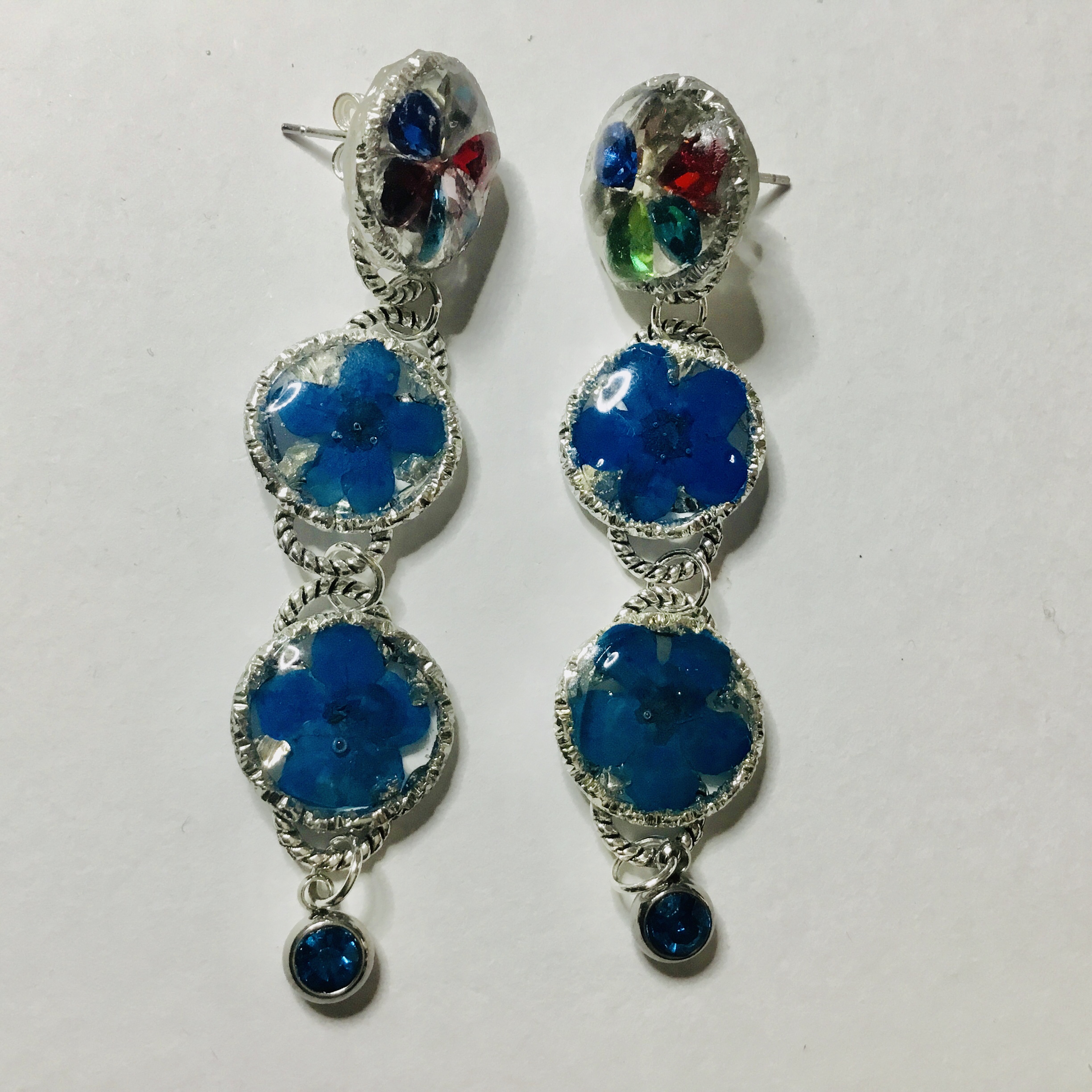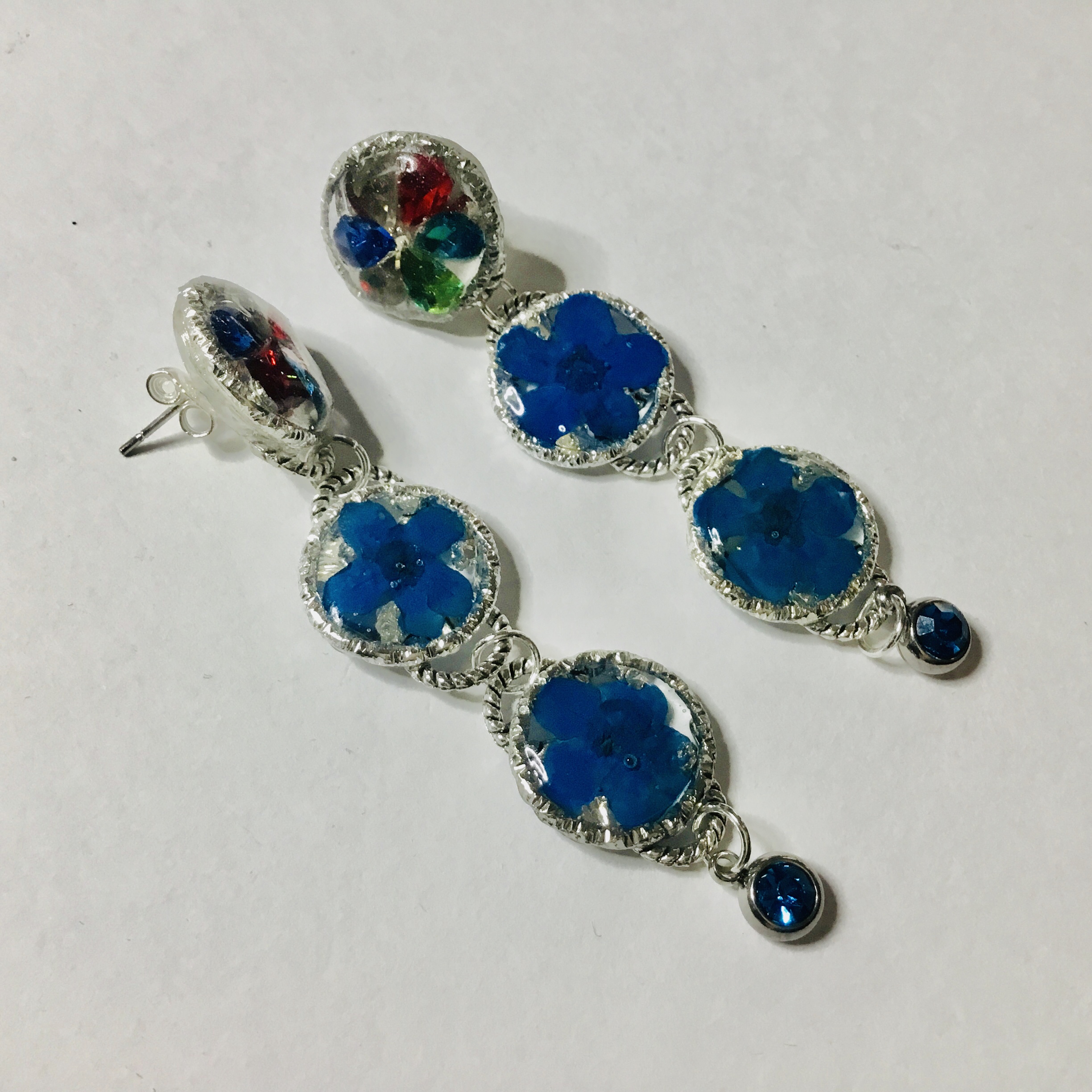 “Blue Memory Blossoms” are delicate, handcrafted earrings featuring real preserved forget-me-not flowers set inside crystal-clear jewelry resin. Each flower is carefully dried to keep its natural bright blue color and placed into a silver setting, creating a wearable piece of art.