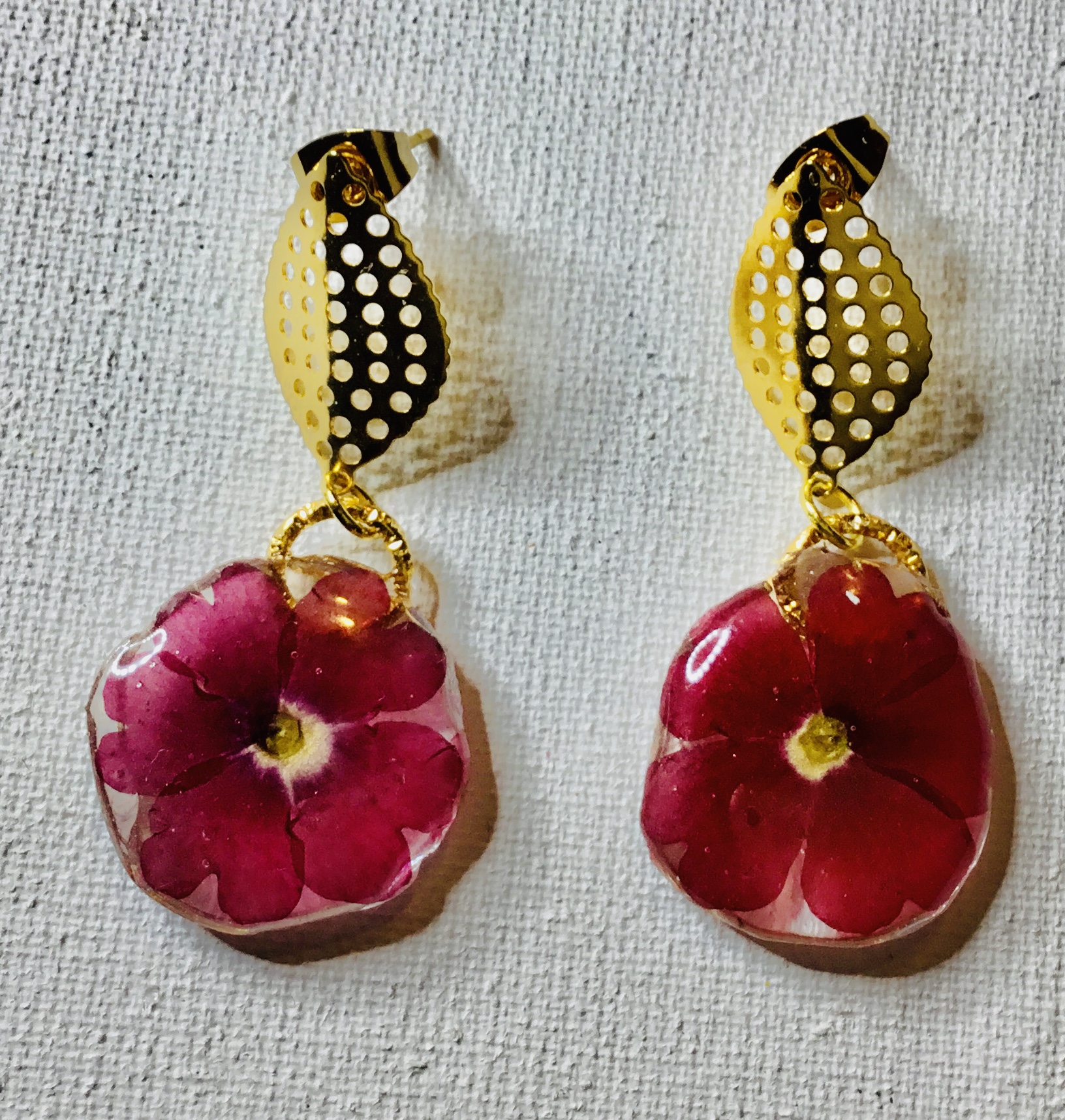 The floral elements are paired with textured gold-tone metal, adding warmth and elegance to the organic composition. The contrast between soft botanical forms and refined metallic structure creates a harmonious balance between fragility and strength, making the earrings both visually striking and emotionally resonant.